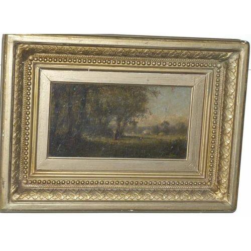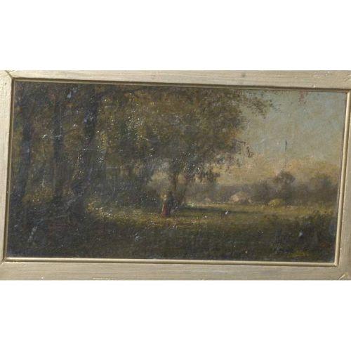 AMERICAN SCHOOL LANDSCAPE, 6"x12" oil on canvas, signed indistinctly lower right, CONDITION REPORT: dirty.