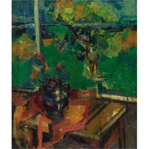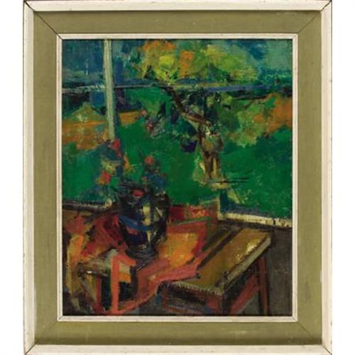 <B>AMERICAN SCHOOL (20th Century)</B></I><BR><I>Still Life before a Window</B></I>, circa 1950<BR>Oil on masonite<BR>24 x 20 inches (61.0 x 50.8 cm)<BR> <B>Condition Report:</B> Minor surface scratches, discolored varnich, otherwise very good.<BR><BR><b>Shipping:</b> Framed - without Glass, Medium (<a target="_blank" href="http://www.heritageauctions.com/common/shipping.php">view shipping information</a>