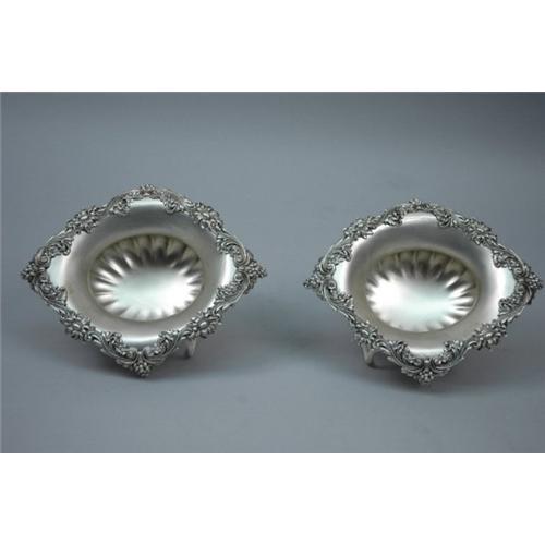 </font></strong>This is a beautiful pair of sterling silver bowls by the Mauser Manufacturing Co. in an exuberant Rococo Revival design. These lovely bowls are the height of the Victorian style. Each stands on four chunky scroll feet and has a lobed, oval body with a flared, everted rim. The rim is meticulously decorated with flowers, leaves and scrolls that are accented at each corner with clusters of grapes. The decoration is incredibly detailed with wonderful texture. Each is in excellent condition and has been finely crafted. Each measures approx. 3 1/4" high, 9" long, and 7" wide and together the pair weighs approx. 32 troy ounces. Each is marked under the base with the maker's mark of the Mauser Manufacturing Co., and the words Sterling, 925/1000 Fine. The elegant size and decoration of these bowls makes them particularly versatile.</font>