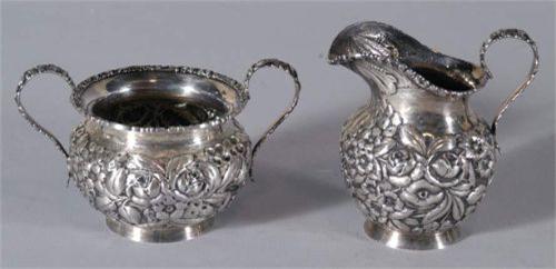 AMERICAN STERLING REPOUSSE CREAMER AND SUGAR, marked B.S.S. Co., 238 grams,, CONDITION: excellent, no damage or repairs. PACKING AND SHIPPING BY FAIRFIELD AUCTION WITHIN CONTINENTAL USA (excluding insurance) $25,