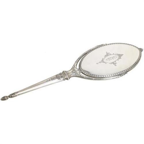 <B>AN AMERICAN SILVER HAND MIRROR</B></I><BR>Alvin Corporation, Providence, RI, Early Twentieth Century<BR><BR>Old English-style monogram to the reverse <I>EH,</B></I> marked on the side <I>STERLING ALVIN</B></I><BR>14.7in. long x 4.5in. wide<BR><BR> <B>Condition Report:</B> Normal signs of wear as appropriate with age; pin dent to reverse; the silver backing on the glass shows very slight antiquing.<BR><BR><b>Shipping:</b> Miscellaneous Collectibles, Larg (<a target="_blank" href="http://www.heritageauctions.com/common/shipping.php">view shipping information</a>)
