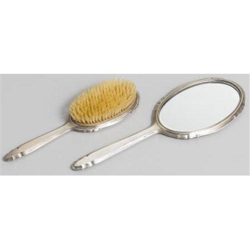<B>AN AMERICAN SILVER HAND MIRROR AND BRUSH</B></I><BR>R. Blackington & Co., North Attleboro, MA, Early Twentieth Century<BR><BR>Script monogram to the reverse <I>T,</B></I> hallmark to the side of the handle with <I>STERLING 5600</B></I><BR>The mirror: 12.5in. long x 4.2in. wide<BR><BR> <B>Condition Report:</B> Normal signs of wear as appropriate with age.<BR><BR><b>Shipping:</b> Miscellaneous Collectibles, Larg (<a target="_blank" href="http://www.heritageauctions.com/common/shipping.php">view shipping information</a>)