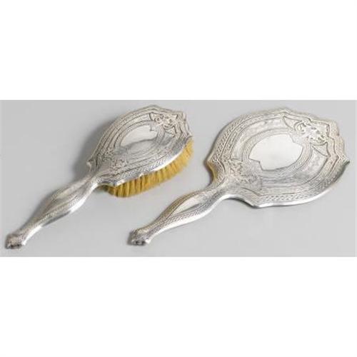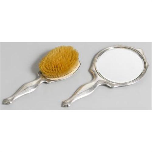 <B>AN AMERICAN SILVER HAND MIRROR AND BRUSH</B></I><BR>Eastwood-Park Co., Newark, NJ, Early Twentieth Century<BR><BR>Hallmark to the front with <I>STERLING</B></I><BR>The mirror: 10.7in. long x 5.3in. wide<BR><BR> <B>Condition Report:</B> Normal signs of wear as appropriate with age; minor dents to reverse of mirror.<BR><BR><b>Shipping:</b> Miscellaneous Collectibles, Larg (<a target="_blank" href="http://www.heritageauctions.com/common/shipping.php">view shipping information</a>)
