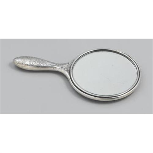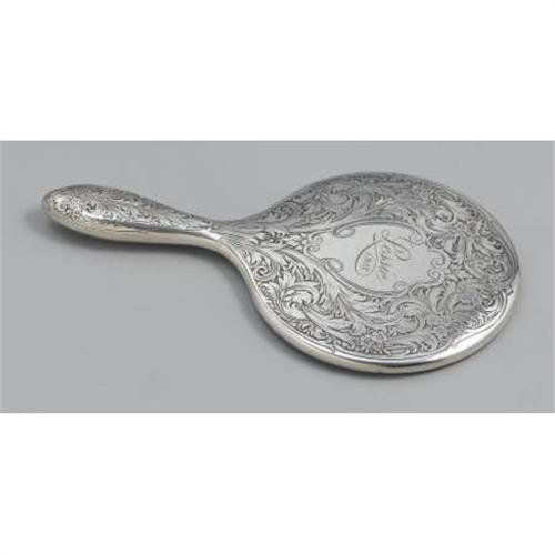 <B>AN AMERICAN SILVER HAND MIRROR</B></I><BR>Wm. B. Kerr & Co., Newark, NJ, Late Nineteenth Century<BR><BR>Marked on the reverse <I>Lessie 1908,</B></I> hallmark with <I>STERLING 3200</B></I> to the side<BR>9.8in. long x 5.5in. wide<BR><BR> <B>Condition Report:</B> Normal signs of wear as appropriate with age; silver backing to the glass shows some antiquing.<BR><BR><b>Shipping:</b> Miscellaneous Collectibles, Smal (<a target="_blank" href="http://www.heritageauctions.com/common/shipping.php">view shipping information</a>)