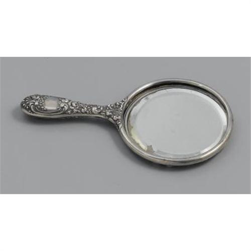 <B>AN AMERICAN SILVER HAND MIRROR</B></I><BR>La Pierre Mfg. Co., Newark, NJ, Late Nineteenth Century<BR><BR>Hallmark to the side with <I>STERLING 373</B></I><BR>8.6in. long x 4.6in. wide<BR><BR> <B>Condition Report:</B> Normal signs of wear as appropriate with age; the fitter rim and glass is loose, silver backing on the glass shows some degredation, dent to reverse.<BR><BR><b>Shipping:</b> Miscellaneous Collectibles, Smal (<a target="_blank" href="http://www.heritageauctions.com/common/shipping.php">view shipping information</a>)