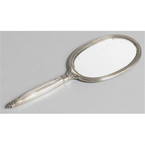 <B>AN AMERICAN SILVER HAND MIRROR</B></I><BR>International Silver Co., Meriden, CT, Early Twentieth Century<BR><BR>Hallmark to the side with <I>INTERNATIONAL STERLING</B></I><BR>13.3in. long x 4.5in. wide<BR><BR> <B>Condition Report:</B> Normal signs of wear as appropriate with age; the silver backing on the glass shows slight antiquing.<BR><BR><b>Shipping:</b> Miscellaneous Collectibles, Larg (<a target="_blank" href="http://www.heritageauctions.com/common/shipping.php">view shipping information</a>)