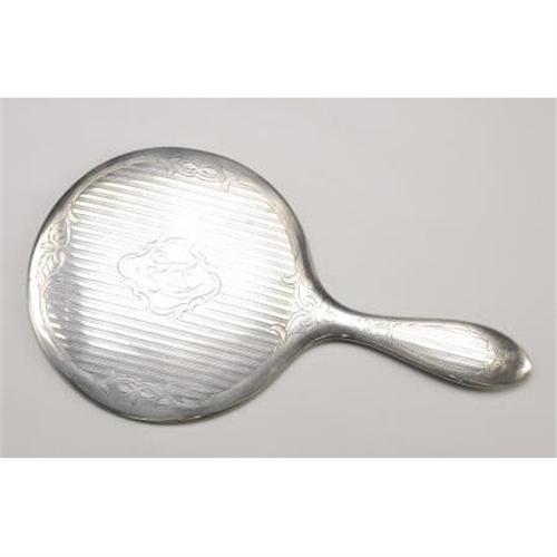 <B>An American Silver Hand Mirror<BR></B></I>Alvin Corp., Providence, RI<BR>Early Twentieth Century<BR>Script monogram to the reverse <I>EEL</B></I>, marked to the front <I>ALVIN/STERLING <BR></B></I>10.7 inches high x 6 inches wide <BR> <B>Condition Report:</B> Normal signs of wear as appropriate with age; the silver backing on the glass is degraded.<BR><BR><b>Shipping:</b> Miscellaneous Collectibles, Larg (<a target="_blank" href="http://www.heritageauctions.com/common/shipping.php">view shipping information</a>)
