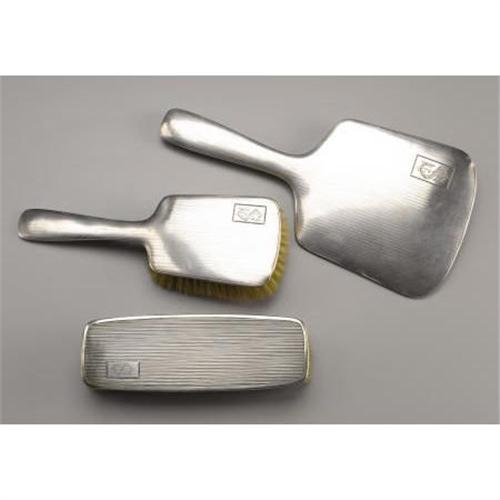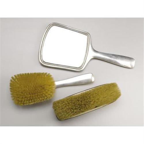 <B>An American Silver Vanity Set<BR></B></I>International Silver Co., Meriden, CT<BR>Early Twentieth Century<BR>Monogram to the reverse <I>ELS</B></I>, hallmark to the front with <I>I.S.Co. STERLING<BR></B></I>11.2 inches high x 5.5 inches wide<BR> <BR>Comprising a hand mirror, hair brush and clothes brush. <B>Condition Report:</B> Minor dents to the reverse, scratches to the glass.<BR><BR><b>Shipping:</b> Miscellaneous Collectibles, Larg (<a target="_blank" href="http://www.heritageauctions.com/common/shipping.php">view shipping information</a>)