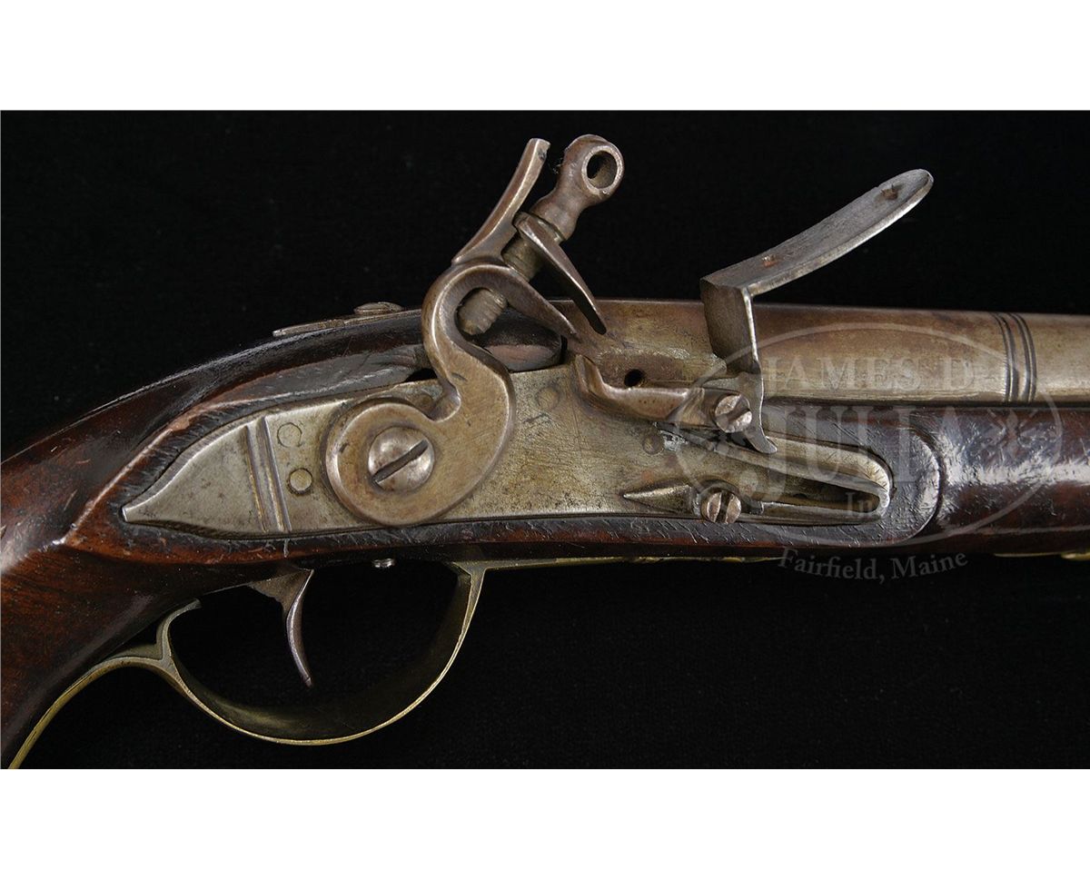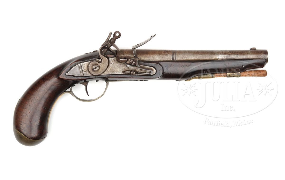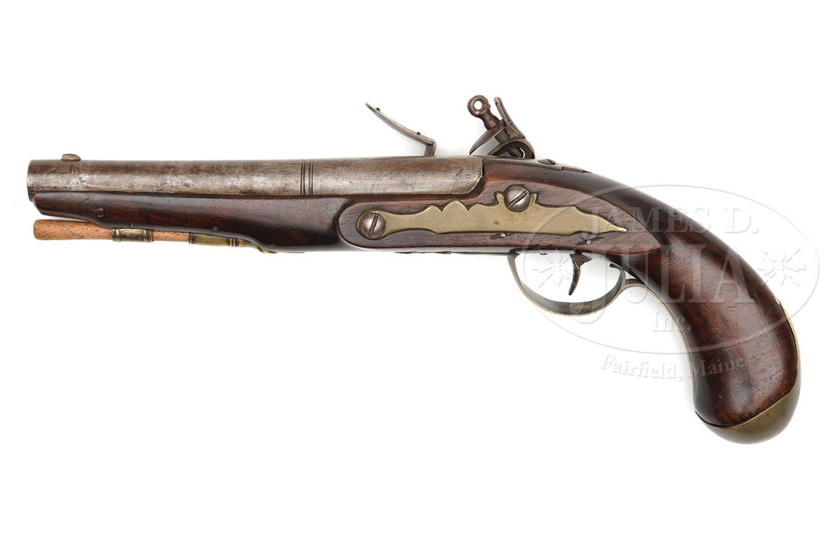 NSN. .64 Cal. x 8" long unmarked bbl. 4 1/4" long Germanic style lock is unmarked and is orig flint missing only a resurfaced frizzen shoe. Brass furniture consists of two ramrod pipes, trigger guard, buttcap and triangular side plate. American black walnut stock is 13-1/2" long and unmarked. Wooded ramrod is 6-3/4" long and not orig to this piece. PROVENANCE: Collection of Dr. Douglas Sirkin. CONDITION: Bbl and lock are in very good condition with slightest of rust around touch hole and associated area of the lock. Brass furniture appears to not all be of one pattern having two different rammer pipe shapes, trigger guard has a 5-fingered finial at the front, buttplate and sideplate are quite plain. Overall this gun is in very good plus condition having never been cleaned and wood has nice square edges. This is a nice example of an American assembled pistol from various parts during the last quarter of the 18th century. 4-50014 PAS67