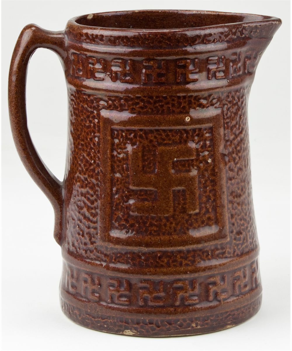 Large brown glazed earthenware pitcher, 8" tall, 6" diameter at top, bears swastikas encircling top and bottom with two larger swastikas on either side, ca. 1925-35. Possibly pre-Nazi era as the emblems bear swastikas in reverse along the upper and lower bands. Obviously a rarer item as most such pitchers in this country ended up in the junk heap once war broke out. Near fine.