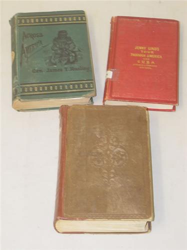 AMERICAN TRAVELS. A Group of 3 Volumes as Listed. Hard Cover. Ex-Library. Good Condition. ***Across America: or, The Great West and The Pacific Coast by James F. Rusling (1874) 1st Edition, NY: Sheldon & Company. 8vo in original illustrated cloth, with binding & hinges tight. Includes frontis, folding map & interior plates. Map has tears, covers have corner & upper/lower backstrip wear. ***Jenny Lind's Tour Through America and Cuba by C.G. Rosenberg (1851) NY: Stringer & Townsend. 12mo in a library binding with original cover laid over, tinted lithograph frontis has tissue guard, binding & hinges tight. ***A Journey Through Texas; or, A Saddle-Trip on the Southwestern Frontier: with a Statistical Appendix by Frederick Law Olmsted (1857) 1st Edition, NY: Dix, Edwards & Co. 8vo in original blind stamped cloth with library cloth backstrip. Half-title, title with frontis, folding map (has tear), occasional foxing, hinges taped, binding tight.