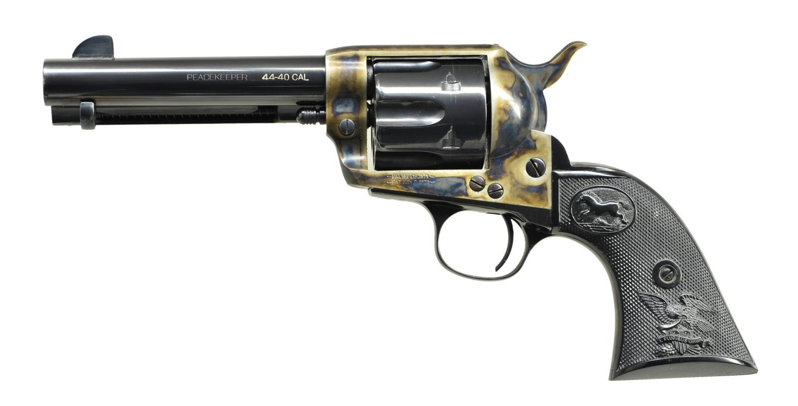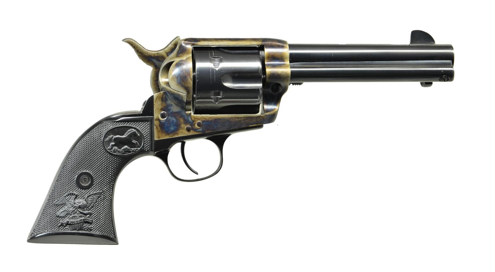 Cal. 44-40. S# P1363. Bbl. 4 3/4" w blade sight plus fame notched rear. Mfg. 2000; components by ASM in Italy & assembled in Florida. Appears to be Colt other than bbl. markings; Colt style checkered black plastic grips having standing horse & eagle logos. Colt patent dates on case colored frame; cased hammer. CONDITION: light radial lines on cyl. plus on cyl. stop leads; all other aspects near excellent including bore & grips. (22-3538/NW). MODERN. $650-900.