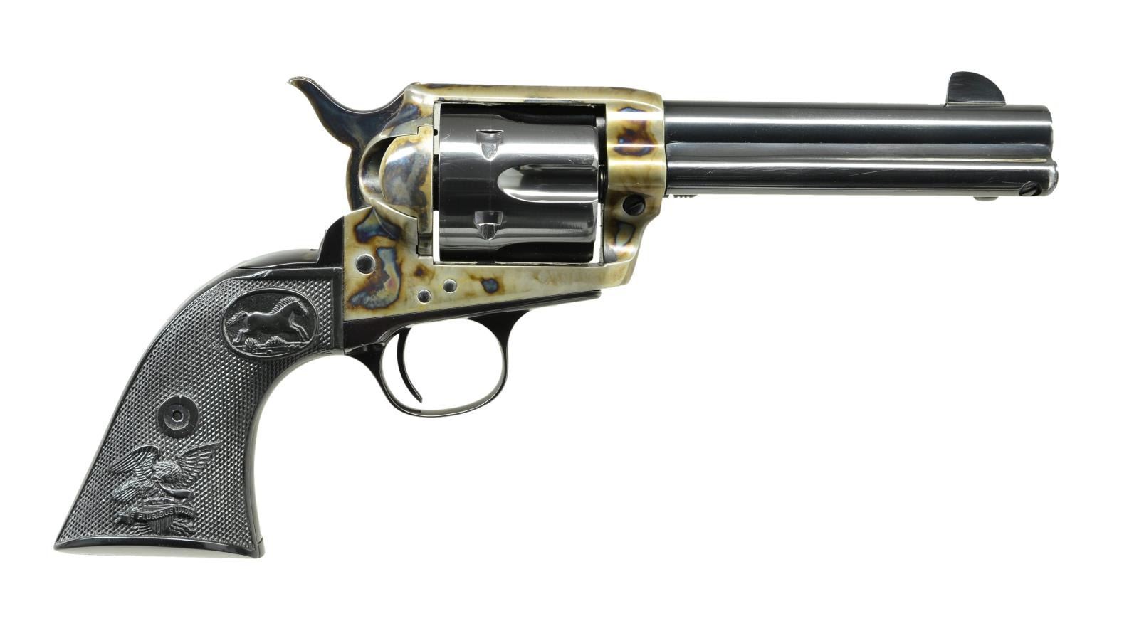 Cal. 45 Colt. S# P019. Bbl. 4 3/4" w blade sight plus fame notched rear. Components mfg. by ASM in Italy & assembled in Florida. 19th AWA Peacemaker produced! Appears to be Colt other than bbl. markings; Colt style checkered black plastic grips having standing horse & eagle logos. Colt patent dates on case colored frame; cased hammer w/ cone shaped firing pin. Matching numbers on trigger guard, backstrap & cyl. CONDITION: just a hint of thinning at beginning of cyl. stop leads & at muzzle; all other aspects near excellent including bore & grips. (22-3523/NW). MODERN. $700-1,000.