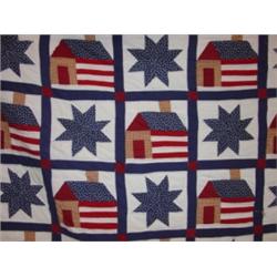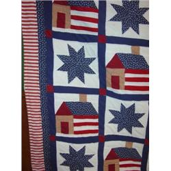 AMERICANA DECORATED SUMMERTIME QUILT. Decorated with stars & stripes & houses. Two spots are held together with pins.