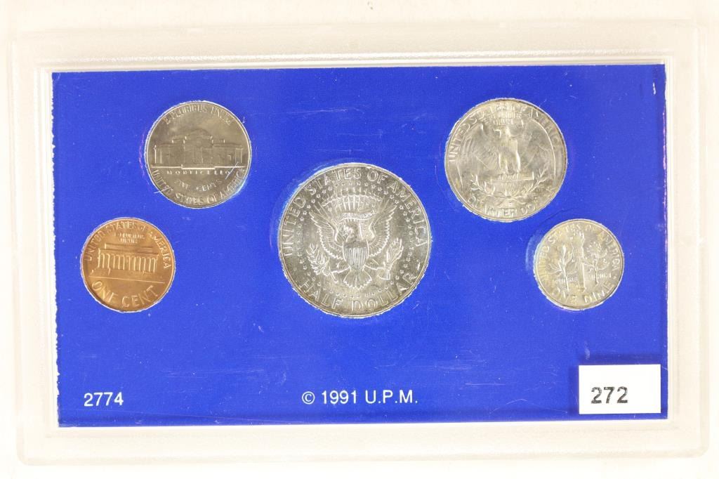 1964 90% SILVER KENNEDY HALF DOLLAR, 1964-D WASHINGTON SILVER QUARTER, 1963-D SILVER ROOSEVELT DIME, 1959 JEFFERSON NICKEL AND 1964-D LINCOLN CENT, IN HARD PLASTIC CASE