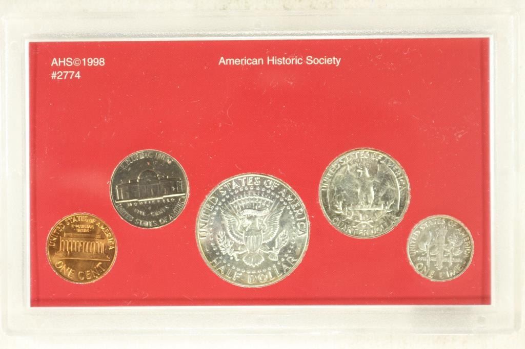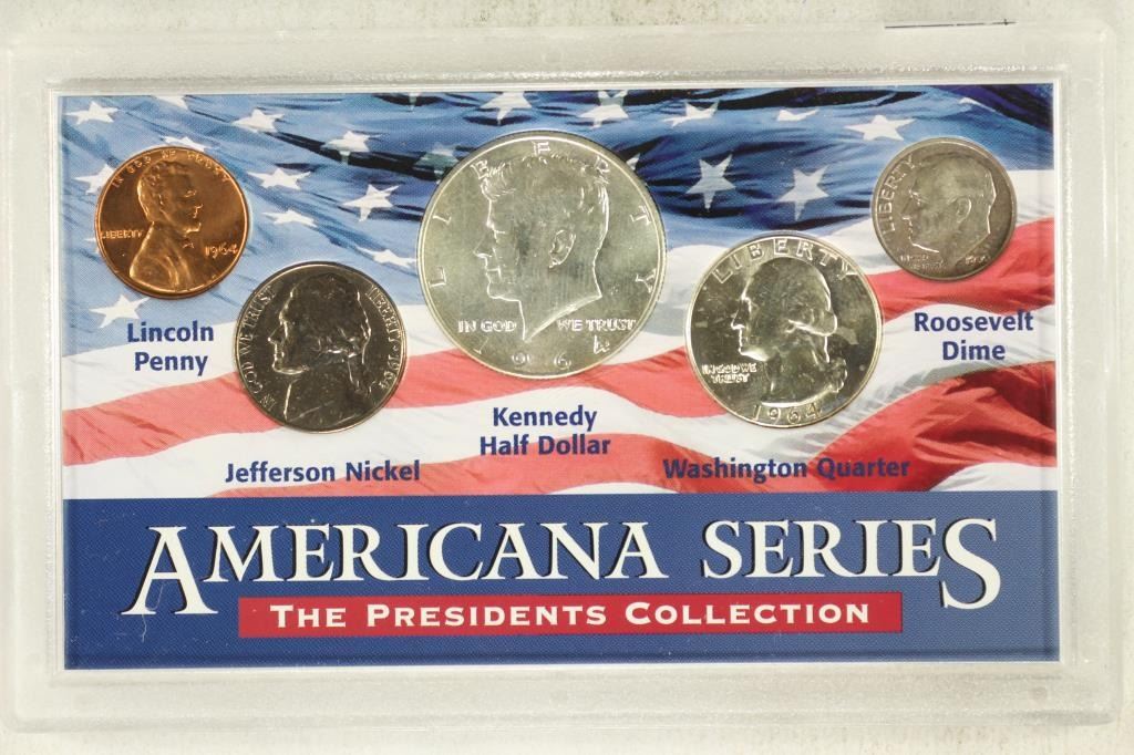 CONTAINS: 90% SILVER KENNEDY HALF DOLLAR, WASHINGTON SILVER QUARTER, SILVER ROOSEVELT DIME, JEFFERSON NICKEL AND LINCOLN CENT