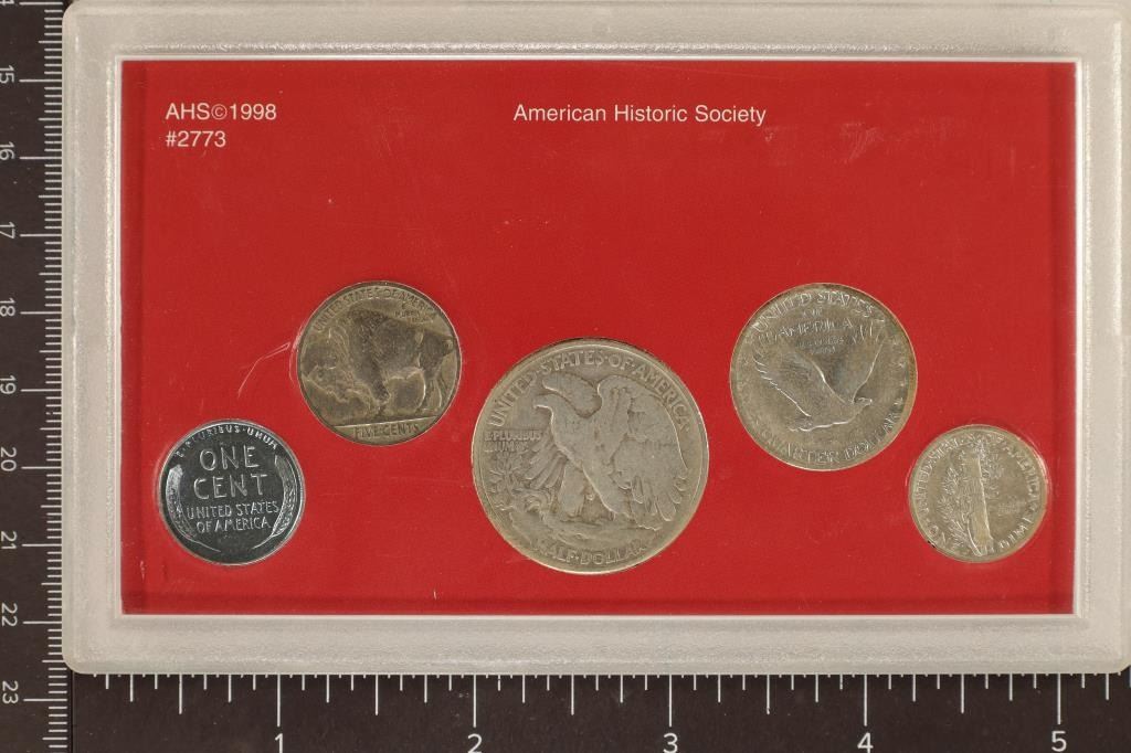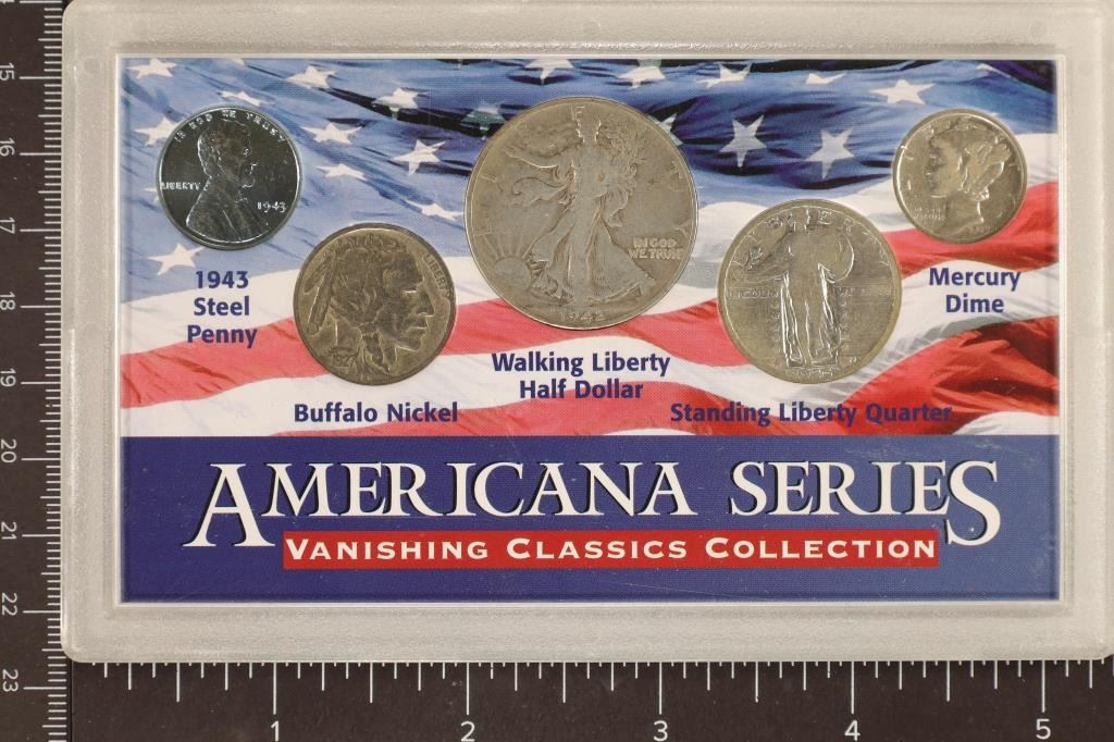 CONTAINS: SILVER 1942 WALKING LIBERTY HALF DOLLAR, SILVER 1926 STANDING LIBERTY QUARTER, SILVER 1939-D MERCURY DIME, 1927 BUFFALO NICKEL AND 1943 LINCOLN STEEL WAR CENT