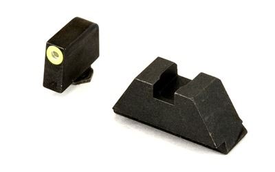 AmeriGlo suppressor height sets provide an elevated sight picture, able to co-witness with slide-mounted miniature red dot optics and suppressors. This flat black rear with tritium front sight set is designed for use on Glock MOS pistols using the Aimpoint ACRO and Holosun 509T optics For more information on how to choose the correct height set for your suppressor or optic, visit the AmeriGlo website, under the INFO tab.