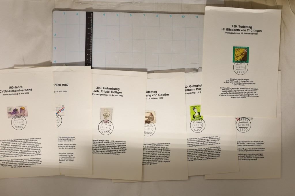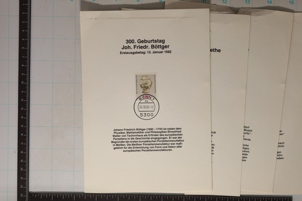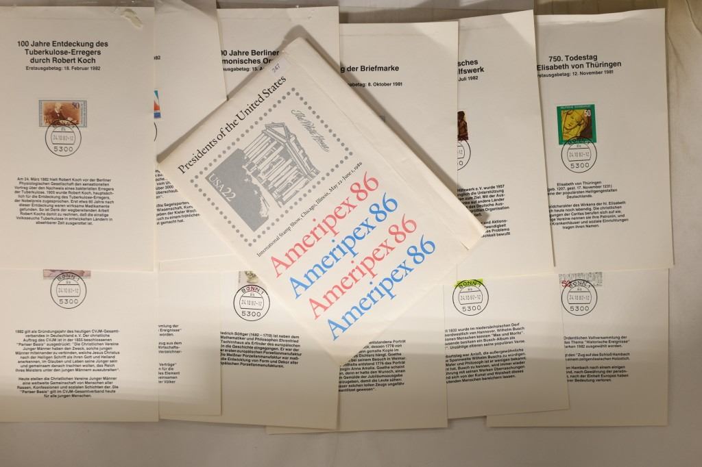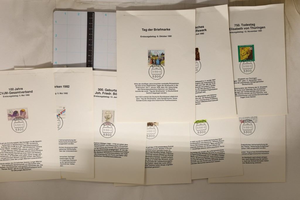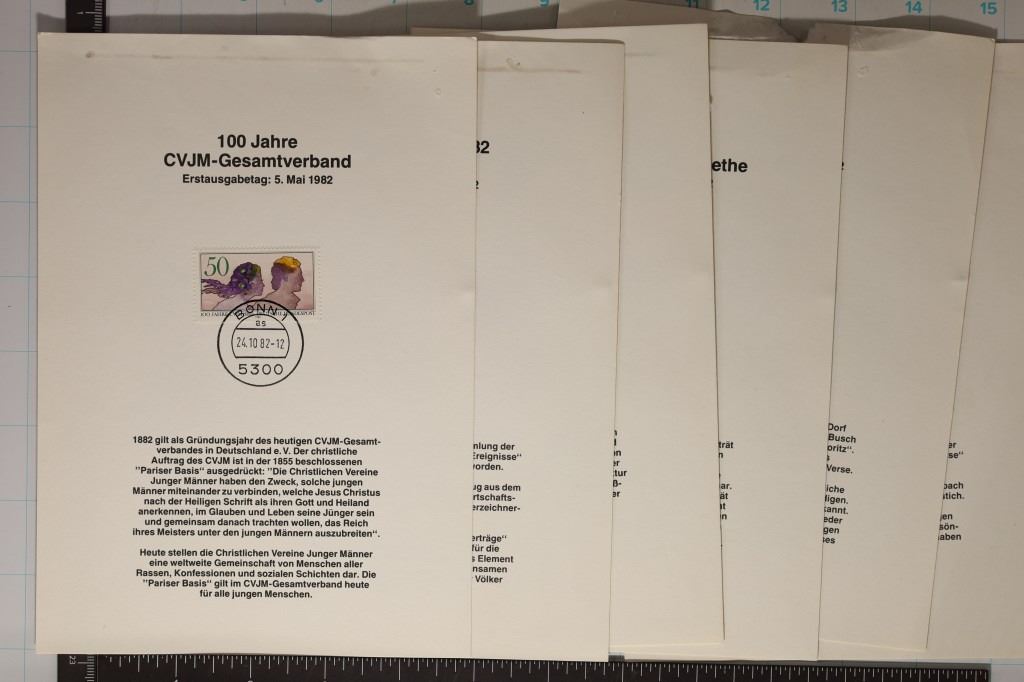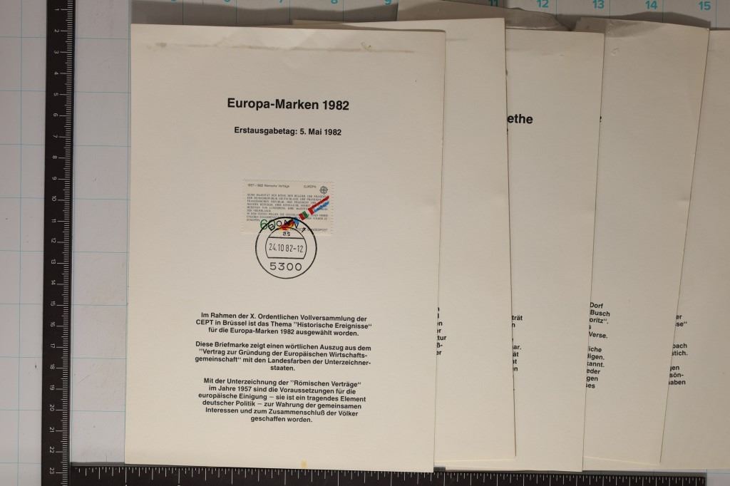 SHOW SOUVENIR SHEETS. 12 PAGES OF FOREIGN STAMPS FROM EARLY 1980'S. EACH ON INFO CARD. GERMAN?