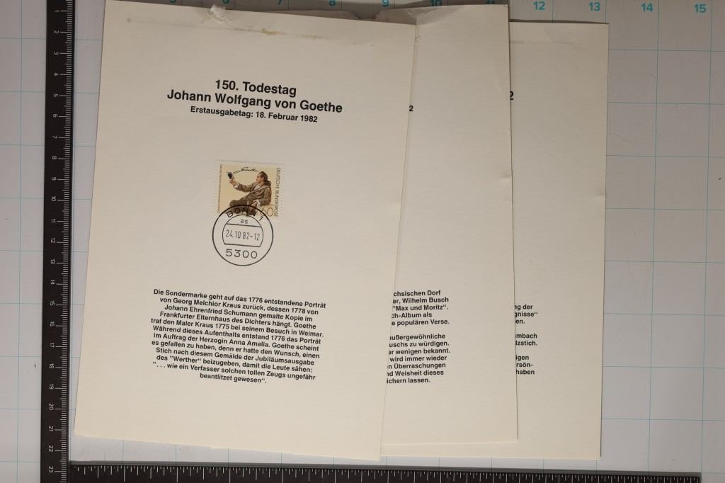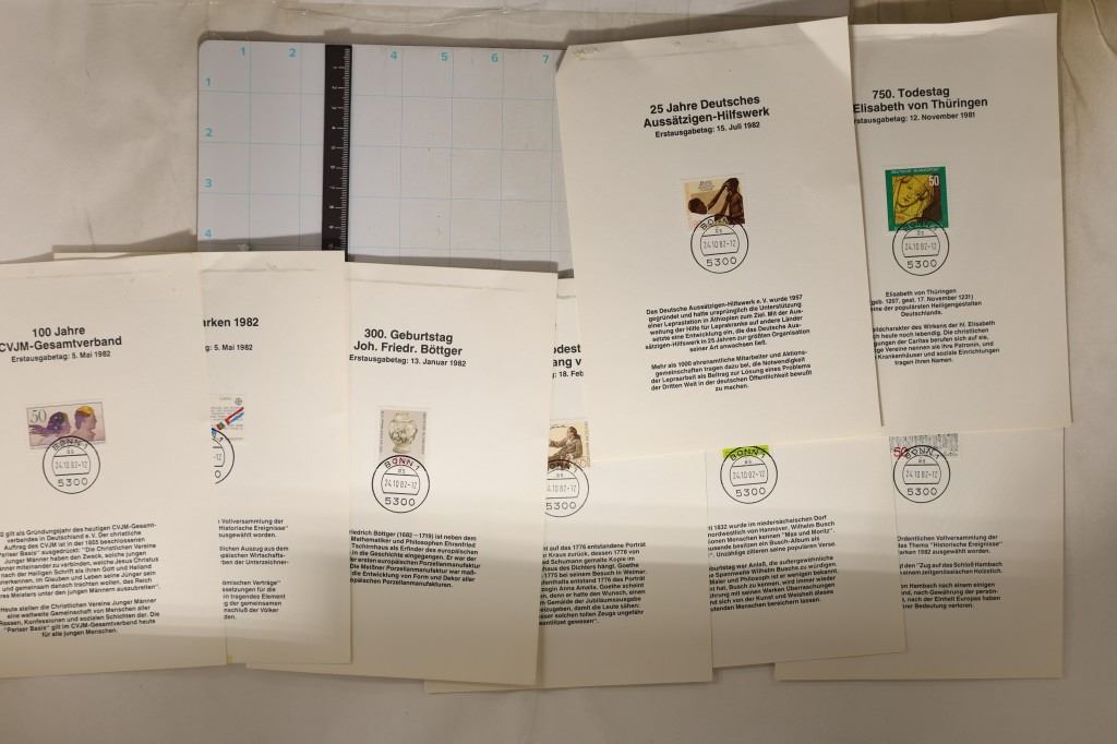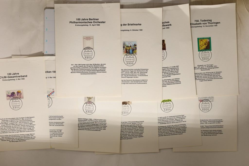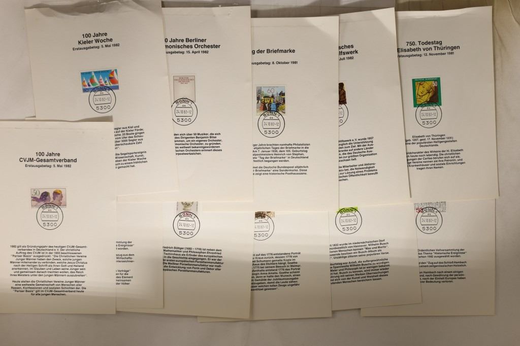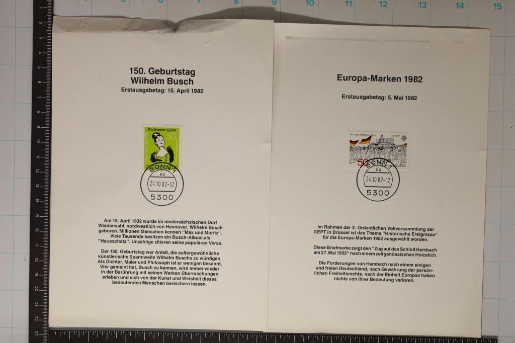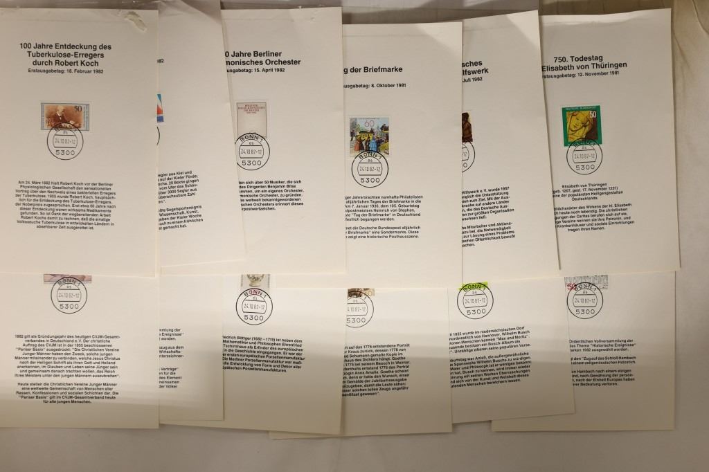 SHOW SOUVENIR SHEETS. 12 PAGES OF FOREIGN STAMPS FROM EARLY 1980'S. EACH ON INFO CARD. GERMAN?