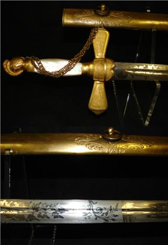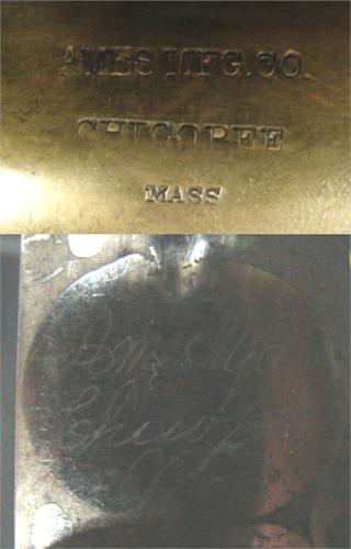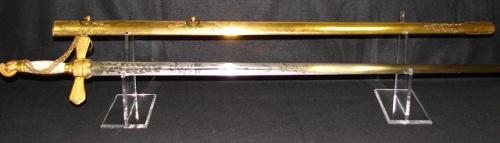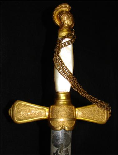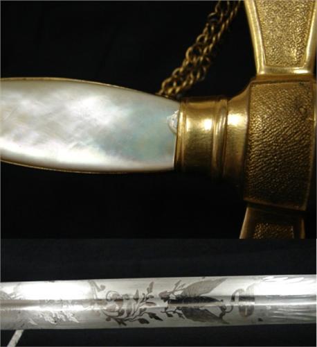 AMES NON-REGULATION MILITIA STAFF OFFICER’S SWORD WITH GILDED SCABBARD. Circa 1850-1860. Has mother of pearl grip, cross quillons and helmet pommel. Pommel is connected to the cross quillons by a heavy double-linked chain. Scabbard and ricasso on sword is marked “Ames Mfg. Co./Chicopee, Mass.” Grip shows one small area of damage. Blade is ornately decorated with floral motif and eagle and shield. Total length: 37 1/8”, Blade length: 31 1/8”