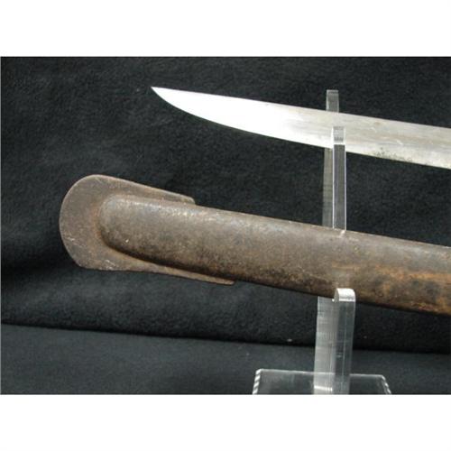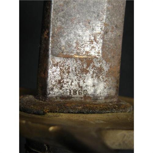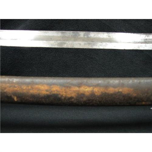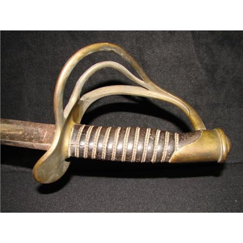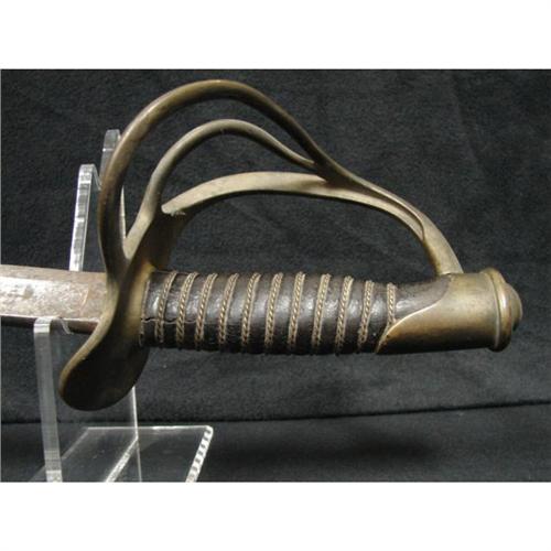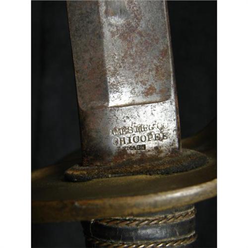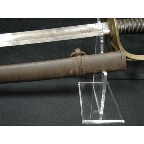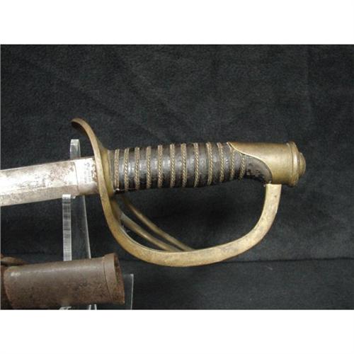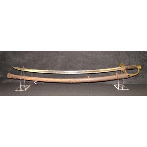 AMES MODEL 1860 LIGHT CAVALRY SABER WITH SCABBARD. Saber is marked on ricasso “AMES MFG. CO./CHICOPEE/MASS.” on one side and “1860” on the other side. Solid brass triple bar guard. Wooden grip is covered with leather and wound with twisted brass wire. Curved steel blade shows some rusting with minimal signs of pitting. Scabbard shows rusting throughout. The Model 1860 was the most widely used Cavalry saber in the Civil War. Overall length: 41.25”. Blade length: 35”.