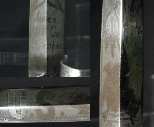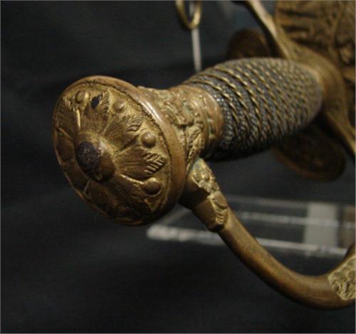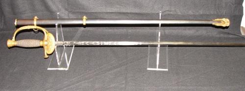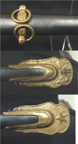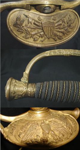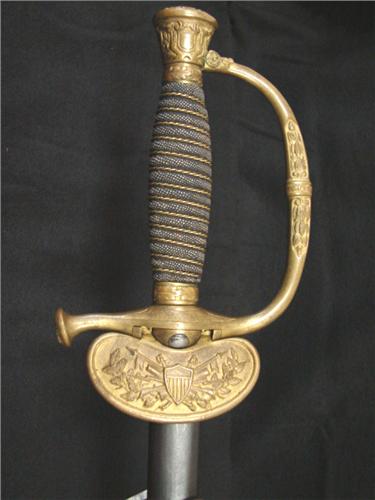 AMES MODEL 1860 STAFF & FIELD OFFICER’S SWORD & SCABBARD. Has gilded brass hilt with shield eagle decoration on kidney-shaped counter-guard. There is a hinged guard on the reverse side that is operated with a button and spring and decorated with military shield. Knuckle-bow is decorated with floral motif at center. Top of pommel is floral decorated. Sharkskin grip is wrapped with twisted brass wire. Blade is marked on ricasso “Ames Mfg. Co./Chicopee, Mass.” Blade is ornately decorated and marked “U.S.” Brass drag on scabbard is decorated with eagle and star on reverse. Because the sword’s scabbard has three rings, it most likely dates to the early 1870s. Scabbards with two rings are indicative of the Civil War period. Total length: 35 ¼”, Blade length: 28 ¾”