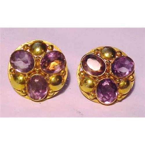 BEAUTIFUL VINTAGE AMETHYST AND GOLD EARRINGS - SCREWBACKS. EACH EARRING HAS 3 LARGE AMETHYST STONE ALL MOUNTED IN 14K GOLD. EACH MEASURES 7/8" ACROSS. THE AMETHYSTS ARE MATCHED IN COLOR AND SIZE. THESE ARE A GREAT ESTATE FIND FOR YOU.