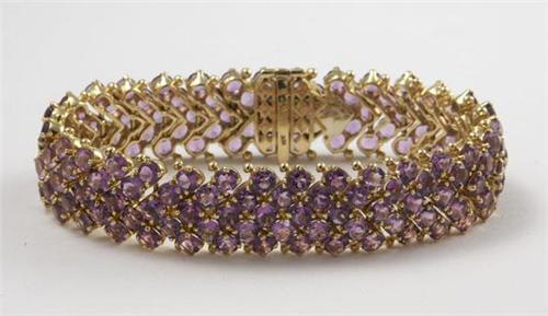 BRACELET: Stunning 18K yellow gold and round cut amethyst bracelet. The amethysts measure approximately 32.00 ctw. Appraisal included.