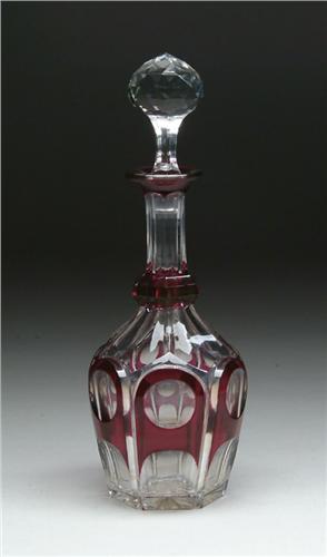 AMETHYST CUT TO CLEAR DECANTER. Large amethyst cut to clear decanter is all over faceted with star cut base and lapidary stopper. SIZE: 12-1/2 in. t. CONDITION: Very good to excellent. Estate of Edwin Schiebel Sr. 5-60123