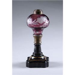 Lot 47 AMETHYST CUT TO CLEAR FLUID LAMP Pretty little lamp has black glass base with gold trim leading to a brass connector which holds the beautiful amethyst font with stylized floral design cut to clear. Center of flowers as well as extending leaves are frosted. SIZE: 8-1/2” t. CONDITION: Font appears to be re-set in connector. Connector is loose at base. 5-70275