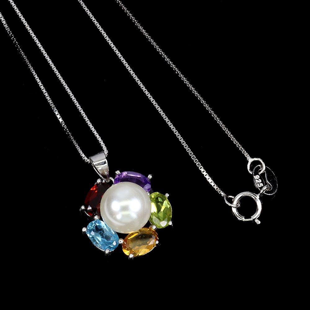 AMETHYST, GARNET, BLUE TOPAZ, GARNET, PERIDOT and PEARL Necklace in 14 K Gold Plated 925 Sterling Silver – 18 inches long - Appraised Replacement Value CAD 460