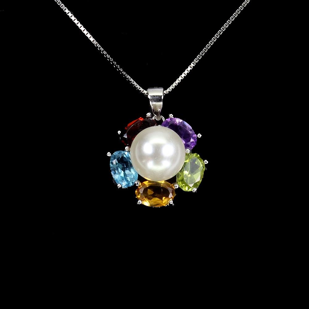 AMETHYST, GARNET, BLUE TOPAZ, GARNET, PERIDOT and PEARL Necklace in 14 K Gold Plated 925 Sterling Si