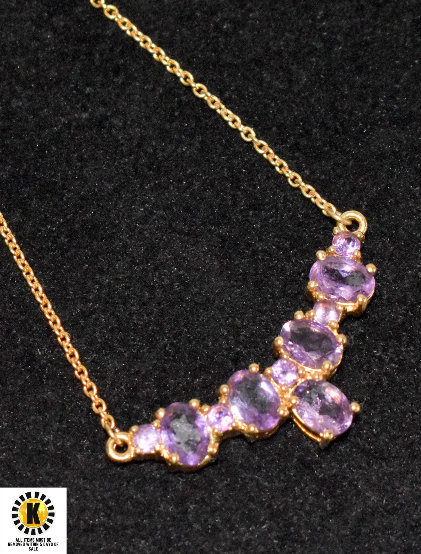 BEAUTIFUL 19" NECKLACE SET WITH 5 LARGE AMETHYST STONES AND 2 SMALLER STONES. GOLD PLATED STERLING SILVER