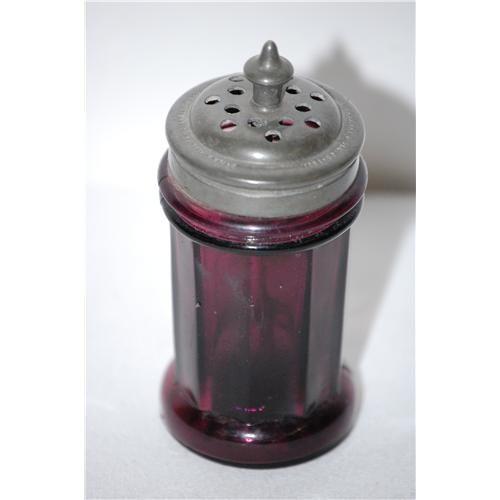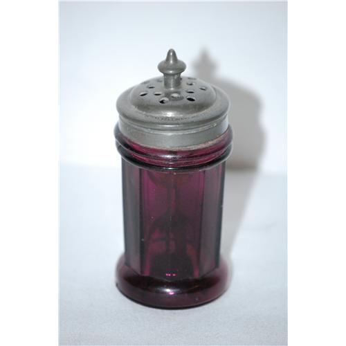 3 1/2" AMETHYST SANDWICH GLASS TALL CHRISTMAS SALT W/ PEWTER LID & AGITATOR-LID W/ DANA K. ALDEN PATENT 1877 (BOSTON & SANDWICH GLASS CO.) - NICE COLOR, MINOR WEAR;