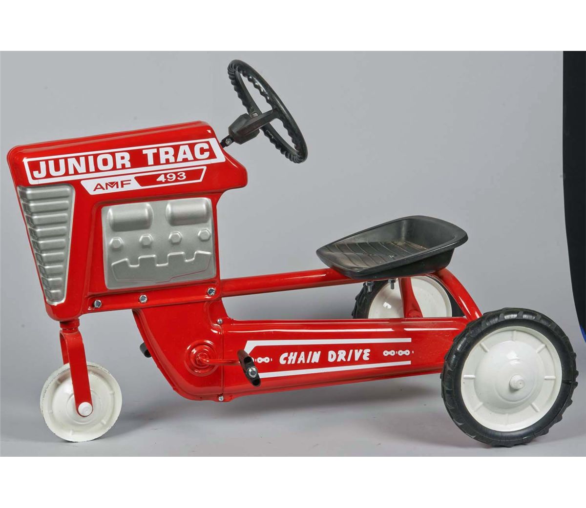 Three wheeled tractor. Restored red with white decals. Missing front tire. Condition (Restored). Size Approx. 34" L.