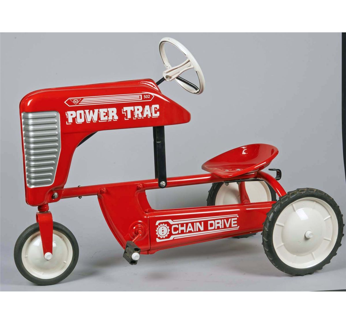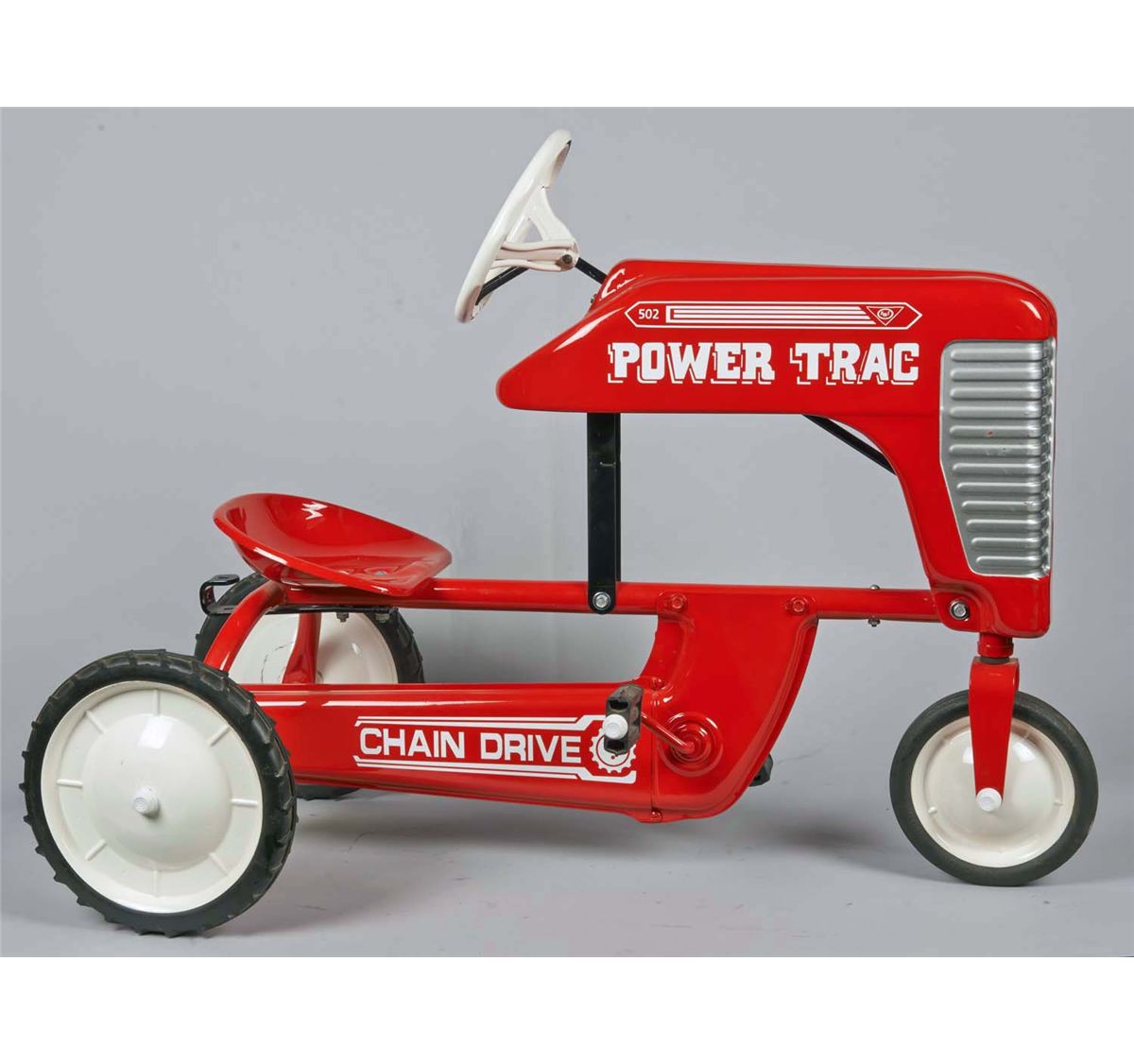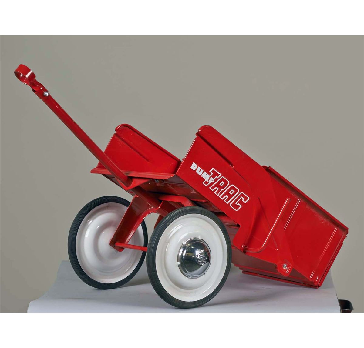 Three-wheeled pedal car with detachable dump trac. Restored in red with white decals, hard rubber pedals, and tires. Condition (Restored). Size Approx. 34" L.
