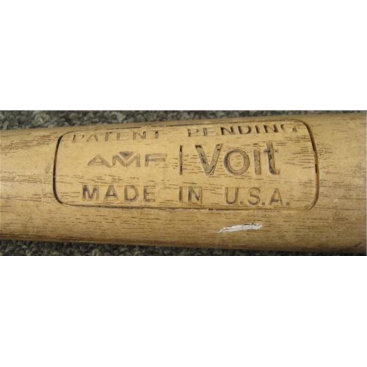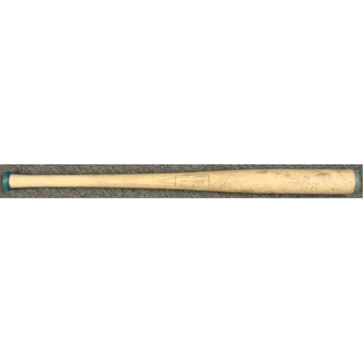 This bat looks like wood, but it's actually some type of nylon. It's not a Whiffle bat though, as it's as weighty as a standard bat. This one is a Little League Approved model, marked 25LL. It was made in the U.S.A. by AMF Voit. It is light tan, with kelly green knob and end cap. There is some wear, scrapes, and nicks, but no real chips, and no cracks. This bat was designed to be unbreakable. Its length is 31". It probably dates from the 1950's or early 60's. * We have never come across a bat like this, and it should be nice for any baseball collector.