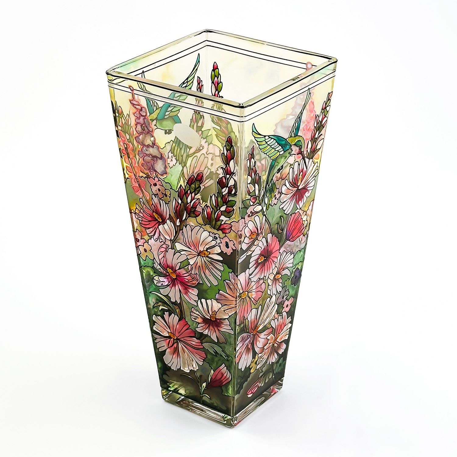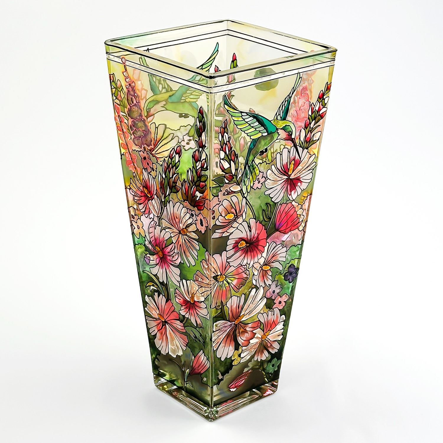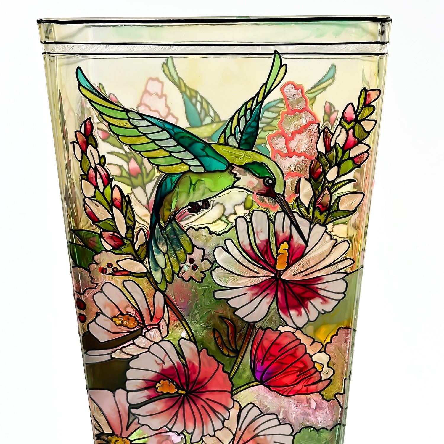 #8145 - HAND PAINTED STAINED GLASS STYLE VASE. COLLECTABLE HOME DECOR SCULPTURE - AMIA VASE - DENVER, COLORADO. VASE HAS A HUMMINGBIRD, FLORAL AND FOLIAGE THEME. MEASURES: 10” (25 CM) TALL BY 4.25” (10.5 CM) SQUARE AT TOP AND 2.5” (6.5 CM) SQUARE AT BOTTOM