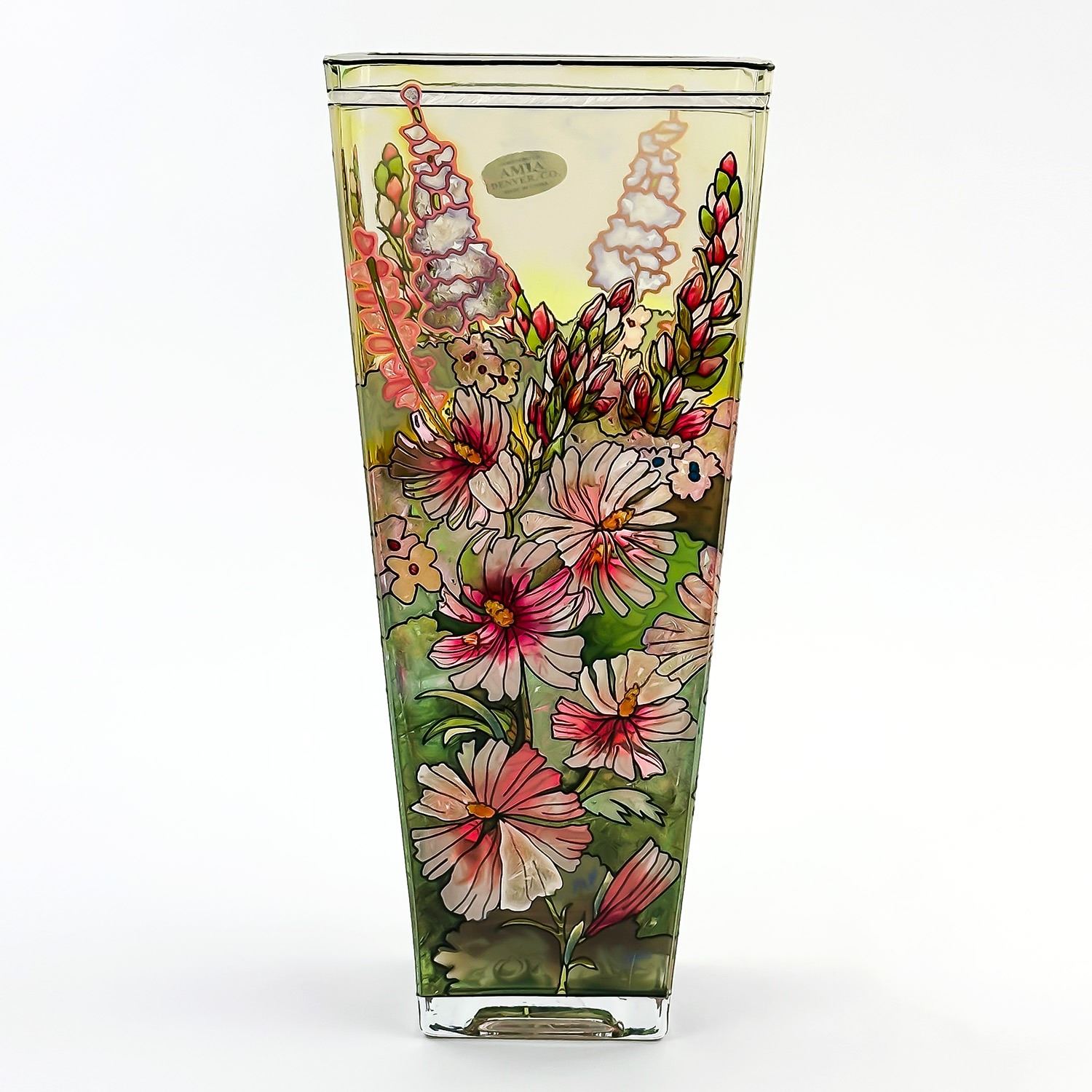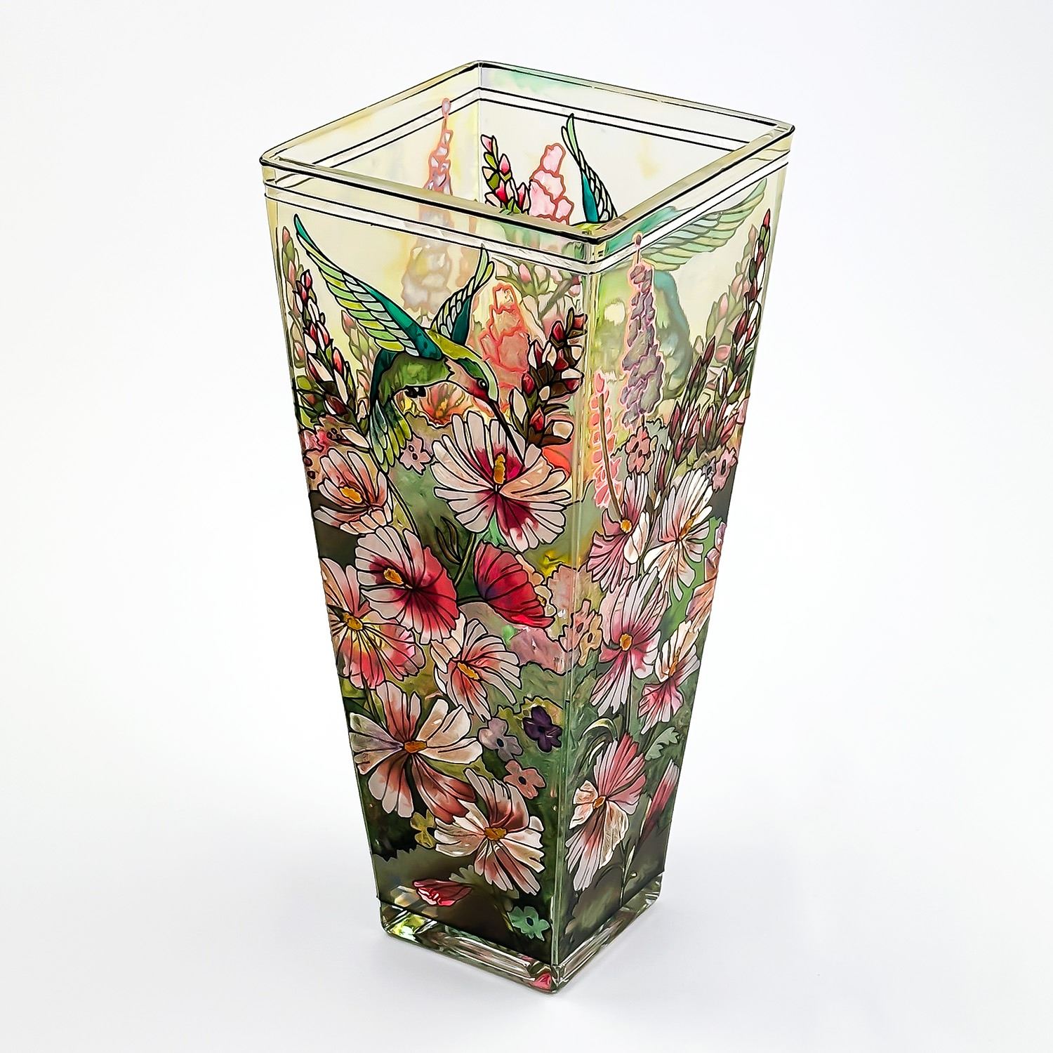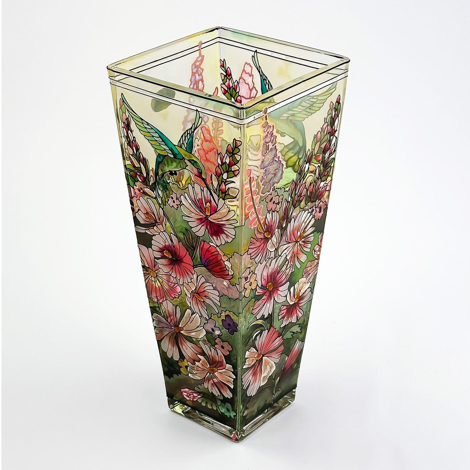 #8145 - HAND PAINTED STAINED GLASS STYLE VASE. COLLECTABLE HOME DECOR SCULPTURE - AMIA VASE - DENVER, COLORADO. VASE HAS A HUMMINGBIRD, FLORAL AND FOLIAGE THEME. MEASURES: 10” (25 CM) TALL BY 4.25” (10.5 CM) SQUARE AT TOP AND 2.5” (6.5 CM) SQUARE AT BOTTOM