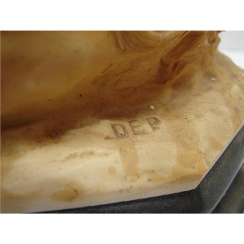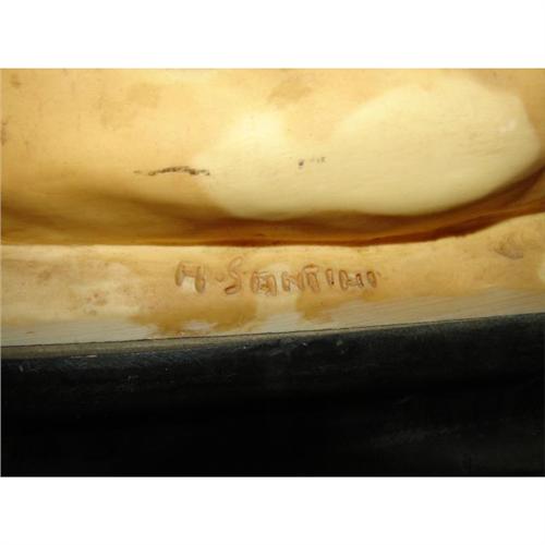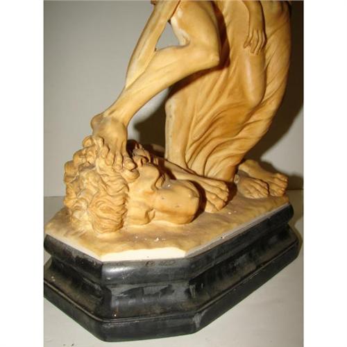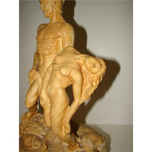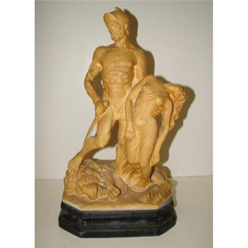 AMILCARE SANTINI CAST RESIN SCULPTURE. Sculpture depicts a Roman soldier holding a lifeless woman and standing near a slain lion. Sculpture is on heavy ebonized base. Signed at bottom at back “A. Santini” “DEP”. 17.25” H