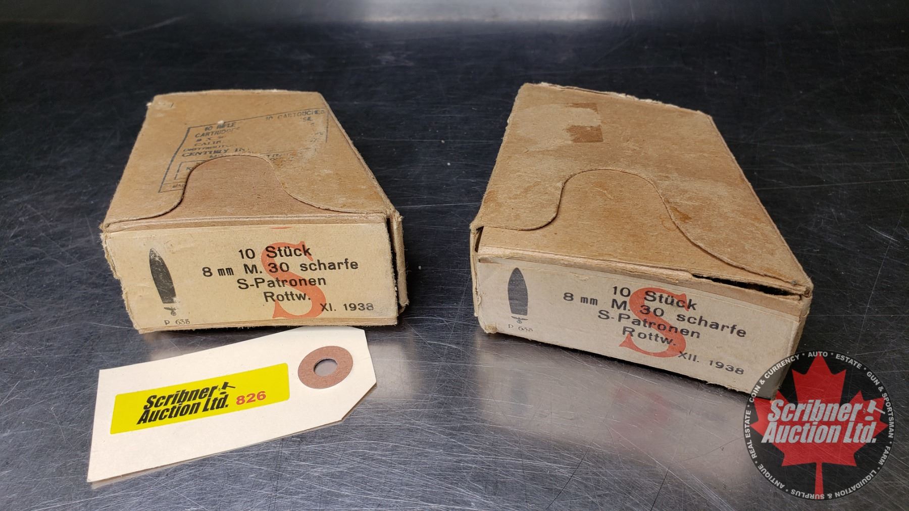 AMMO: 1938 Nazi/Eagle Marking "10 Stuck 8mm M. 30 Scharfe S. Patronen Rottw. X111938" (8mm Mauser w/Stripper Clips) (2 Boxes) (War Time) (NOTE: This is Vintage Ammunition)