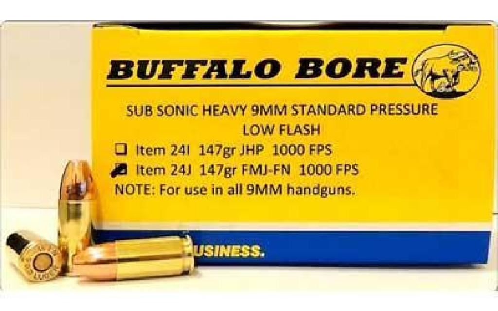 Buffalo Bore Ammunition, Subsonic Heavy 9MM, 147 Grain, Flat Nose Full Metal Jacket Product Specifications UPC Code: 651815024103 Manufacturer: Buffalo Bore Ammunition Model: Subsonic Heavy 9MM Caliber: 9MM Grain Weight: 147Gr Type: Full Metal Jacket Description: Subsonic Units per Box: 20 Units per Case: 240 Manufacturer Part #: 24J/20