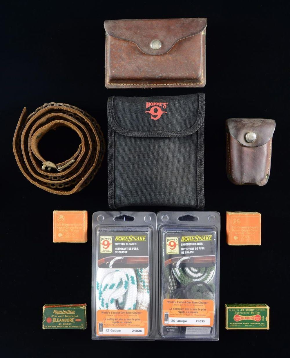 - 45+ RDS. (2 BOXES) of vintage Rem. Kleanbore 22 Short; 1 box is "Dog bone" variant. - 50 RDS. (2 SEALED BOXES) Belgian 32 ACP. CONDITION: ammo appears serviceable. Rem. boxes in fair condition w/ fraying. Hunter brown leather cartridge pouch containing 19 spent cases & 1 Rem. soft point cartridges of 30 Rem. 1 Hunter brown leather mag. pouch. 1 Approx. size 32 cartridge loop belt. 3 Hoppies 9 bore snakes. CONDITION: items in fair to very good overall condition. (02-20909/MD). $50-75.