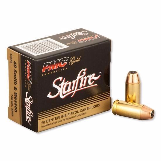 Mfr Items:PMC Category:CENTERFIRE HANDGUN ROUNDS Caliber:40 Smith & Wesson Bullet Type:StarFire Hollow Point Bullet Weight:180 GR Muzzle Energy:388 ft lbs Muzzle Velocity:985 fps Rounds Per Box:20 Application:Performance/Protection
