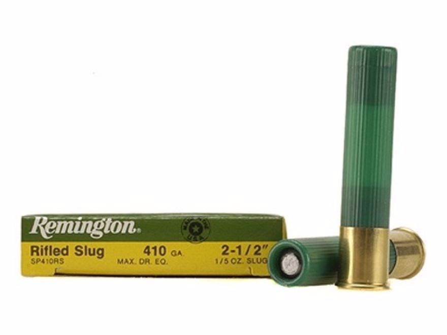 (200 ROUNDS) Mfr Items:Remington Ammunition Category:SHOTSHELL STEEL LOADS Mfr Scan:RBUCK Model:Slugger Series:Rifled Slug Gauge:410 Gauge Type:Rifled Slug Length:2.5" Ounces:1/5 oz Shot Size:Slug Muzzle Velocity:1830 fps Rounds Per Box:5 Boxes Per Case:50 Shot Type:Hunting Application:High
