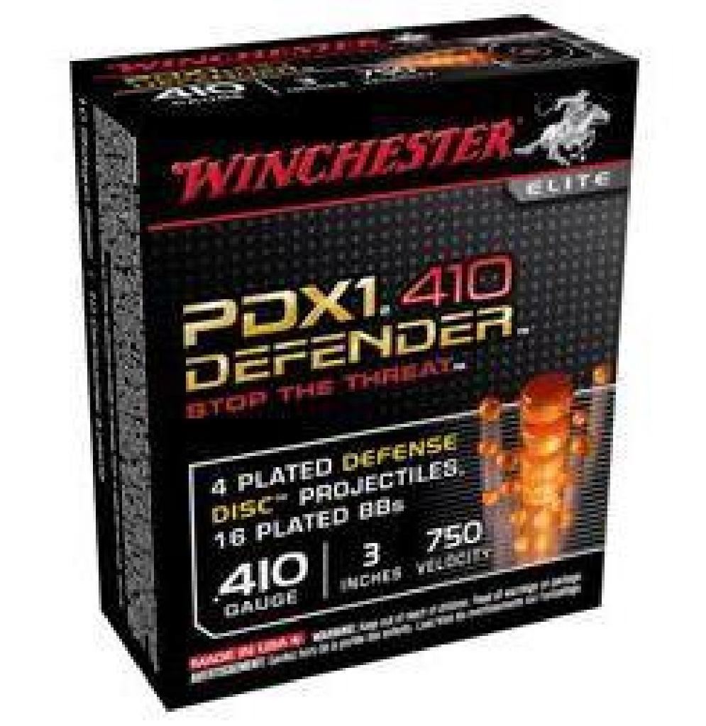 Product Specifications:S413PDX1 Mfr Items:Winchester Ammo Category:SHOTSHELL LEAD LOADS Gauge:410 Gauge Type:Personal Defense Length:3" Shot Size:4 Defense Discs/16 BBs Muzzle Velocity:750 fps Rounds Per Box:10 Application:Home Defense/Hunting