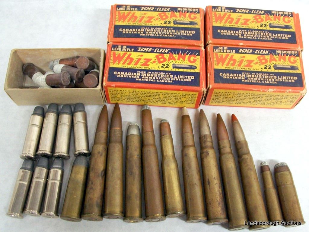 14 RNDS 32 RIMFIRE SHORT, 200 RNDS 22LR WHIZBANG IN VINTAGE BOXES, 45 RNDS ASSORTED RIFLE AND PISTOL AMMO INCLUDING 303 BRITISH DUM DUMS, 30 NEWTON, 38 SPL, 25-20 WIN, 32-40 WIN, 577 SNIDER, 500 NITRO FOR BLACKPOWDER EXPRESS, 577/ 450 MARTINI, 57 SNIDER SHOTSHELL, 40-50 SHARPS, 40-60 WIN, 38-72 WCF, 40-70 SHARPS, 8 X 50 LEBEL, 9MM MAUSER, GIBB 256 MAGNUM.