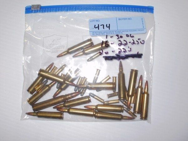 BAG CONTAINING: 16 ROUNDS OF WINCHESTER 22-250, 20 ROUNDS OF 22 LR & 1 30-06 ROUND