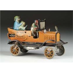 AMOS ‘N’ ANDY FRESH AIR TAXI.  By Marx, U.S.A.  Cpt. Correll & Gosden, radio and TV characters in Model-T Ford move forward with a shake, rattle and roll action.  SIZE:  8” l.  CONDITION:  A very good example with some fading to one side of figures.  Retains all original figures, mascot, windshield, and crank.  WP 1-3662 (450-600)